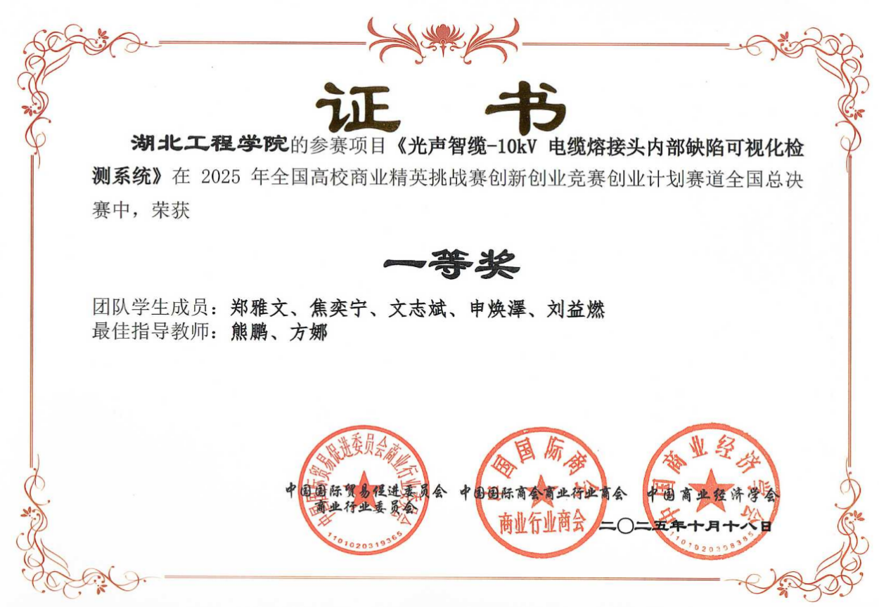 我院参赛团队在学院的大力支持与指导老师的精心培育下,凭借优秀的项目设计、扎实的调研数据和出色的现场表现,在多个赛道中脱颖而出,成绩喜人。在创业计划赛道,郑雅文、焦奕宁、文志斌、申焕澤、刘益燃等同学完成的项目《光声智缆-10kV电缆熔接头内部缺陷可视化检测系统》荣获全国一等奖(指导老师:熊鹏、方娜)。