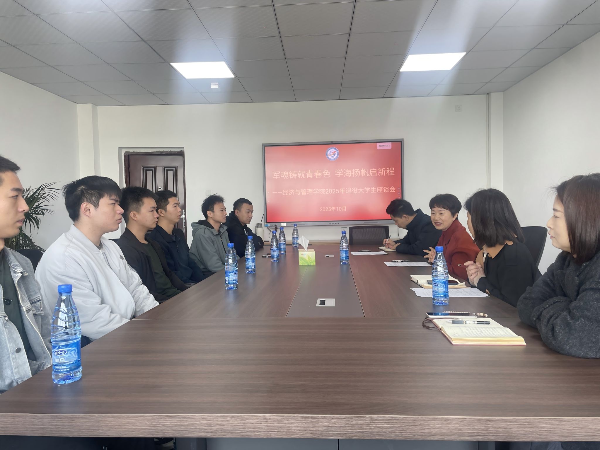 青春献国防,荣光归校园。2025年10月24日上午9时,经济与管理学院在经法楼401会议室举行了2025年退役大学生座谈会。六名退役大学生代表深情讲述军旅淬炼的成长历程,畅谈重返校园的使命担当,展现出新时代青年学子从军人到大学生的精彩转型。学院党委书记刘莉萍、党委副书记肖萍及辅导员老师参加座谈会,并与同学们深入交流。
